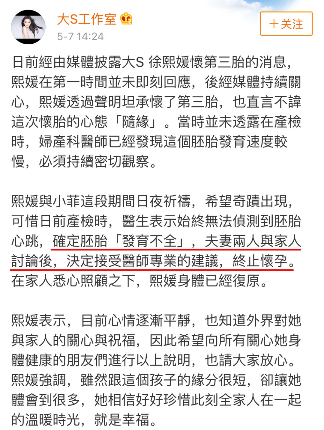 昨天下午得知了一条让人难过的消息:由于胚胎发育不全,大S和家人决定终止怀孕第三胎。