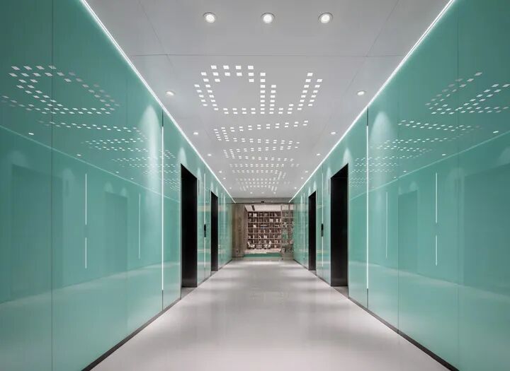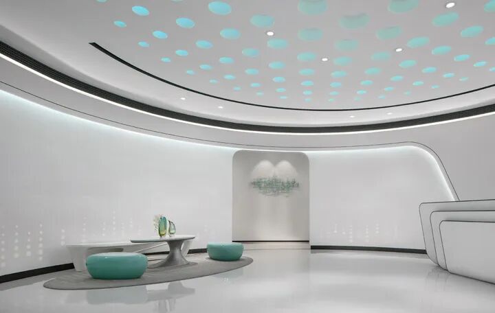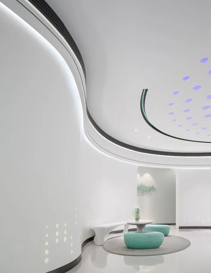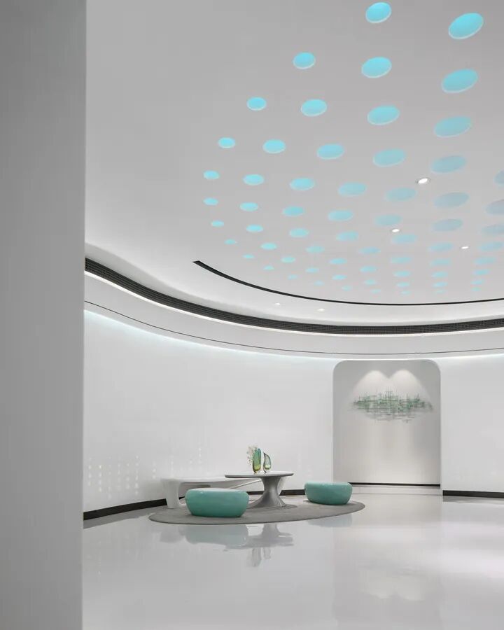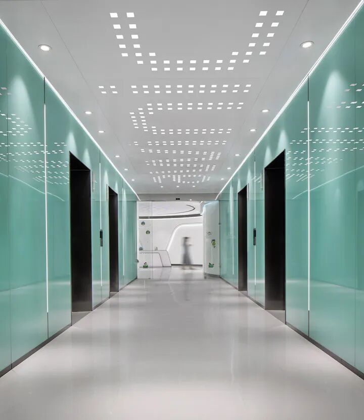 充满科技与未来感的电梯厅在设计上给人深刻的视觉冲击力,大面积的蓝色与白色结合,将科技的浪漫与理性完美融合。