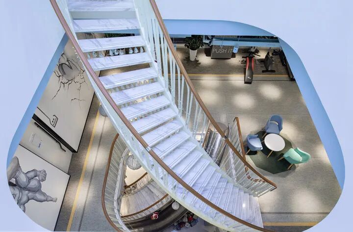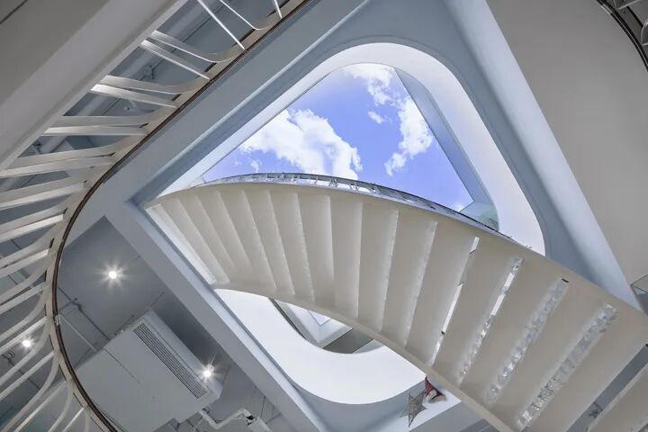 在阅读区,一座漂亮的弧形楼梯向上升腾直至三层天花顶,如同中流砥柱一路贯穿起各个工作楼层,紧密相连的同时又确保各区域的独立性。