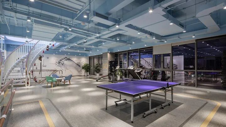 在这150㎡的健身区集合了跑步机、椭圆机、动感单车、乒乓球、瑜伽、舞蹈等运动功能,满足员工不同的运动需求。