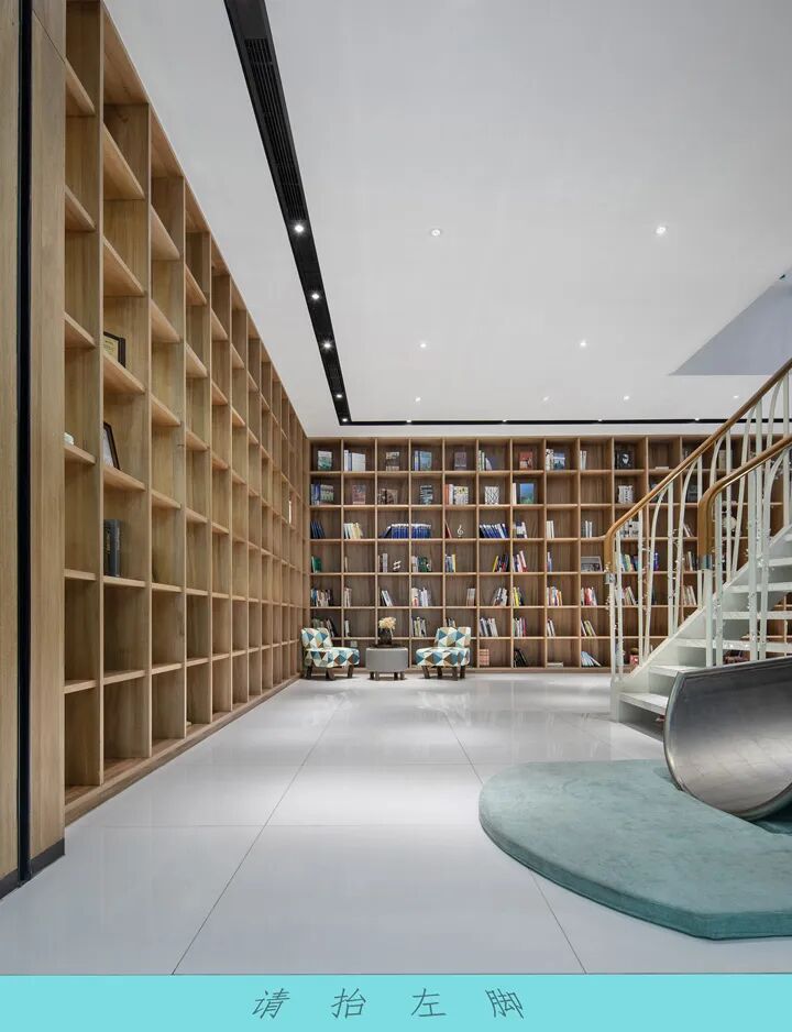 在弧形楼梯的挑空空间,我们规划了复合阅读区,实木书架上摆放了近千册书籍,同时陈列了历年艾为文创定制纪念品以及摆件,工作闲暇时刻,这里是我们为“艾为人”准备的象牙塔。