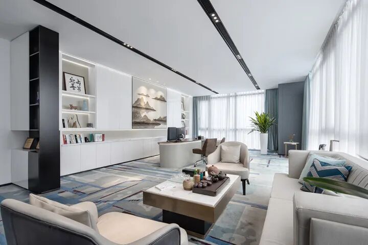 办公风格整体以稳重大气为主,背景墙上悬挂的立体装置油画取材于中式山水画,呈现了中国画的意境,绝妙之处在于以晶圆为旭日,用沙石和芯片铺路,将金箔推满山脊,象征着艾为的事业是点沙成金。