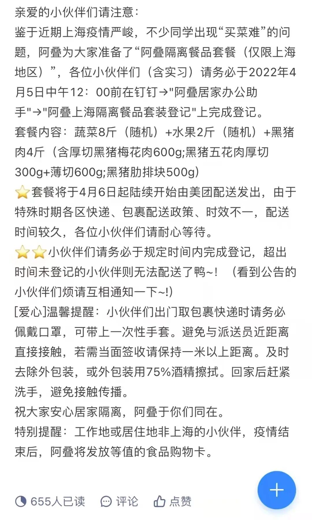 值得一提的是,叠纸和蛮啾为员工配送的礼包内容非常相似,都是蔬菜+水果+黑猪肉的组合,总量在10斤以上,基本上可以满足1个人在家半月的消耗量。有知情人士告诉茶馆,叠纸、蛮啾、鹰角可能找的都是同一个供应商,现在有更多的上海游戏企业行动起来寻找供应商为自家员工配送物资。