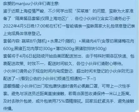 在上海疫情全面爆发的一周前,鹰角已经通过线上兑换和线下领取两种方式为员工特供蔬菜包,其中线上有多达十种菜品类型,线下则是花菜、大头菜、胡萝卜、黄瓜、西蓝花各3斤。