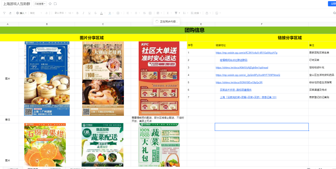 茶馆看了一眼这个文档,内容比想象的要丰富,随便看一眼左上角都有同时超过100人在查看或编辑文档,尤其是团购页面贴了大量的商家海报与联系方式,十分友好也超级实用。