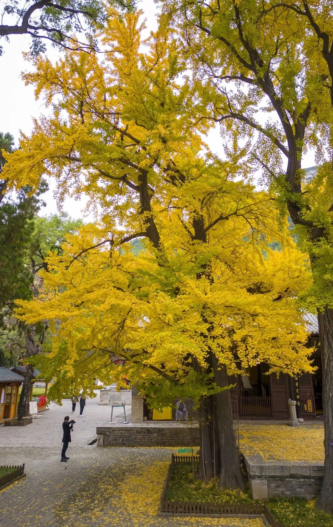 片片银杏叶远远望去,呈现出黄澄澄的光辉,落在地上的银杏叶,踩上去软绵绵的,似给寺院盖上了一层柔黄的地毯。