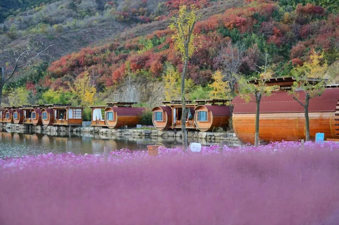 在九如山背山临湖的美景中,大片的粉黛乱子草迎风摇曳,轻柔的秋风吹过,掀起层层“海”浪,粉黛如丝,让人忍不住想伸手感受这云雾般的温柔。山脚下,红色木桶酒店与粉黛乱子草的粉色浪漫相拥,与碧绿清澈的湖面相互映衬,雨小荷也忍不住想要去体验一番这秋日的浪漫!