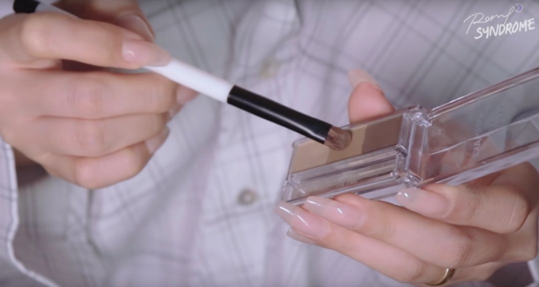 1. 眉粉是打造自然眉毛的关键,首先用一把扁头小刷子蘸取眉粉的中间色。