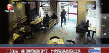 广东汕头一外卖小哥,在一路小跑后进屋取餐时,没想到把玻璃门撞碎了。