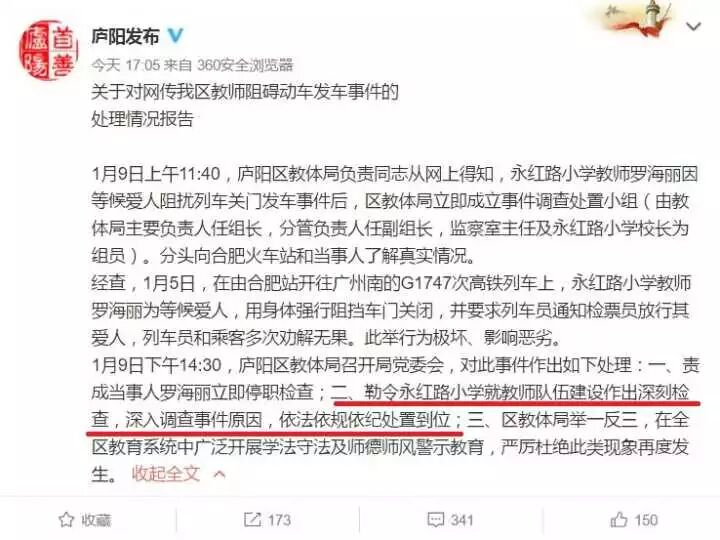 庐阳区教体局已对其作出停职检查的处理决定。