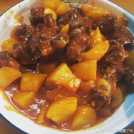 @_最靓的兔腩:烧肉啊 烧好了切成片夹上土豆片和炸豆腐条 浇上腐乳白糖蚝油生抽调好的汁 上锅蒸 出锅撒点儿小葱 用汁浇饭我都能吃好几碗