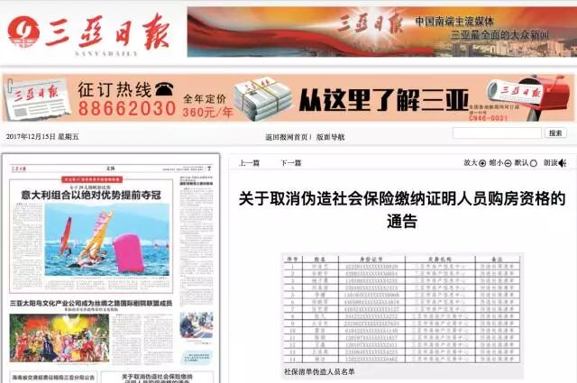 12月15日,海南省三亚市住房和城乡建设局在《三亚日报》上发布《关于取消伪造社会保险缴纳证明人员购房资格的通知》公告,取消14名伪造社会保险缴纳证明人员的购房资格,并公布具体名单,汽车调频了解到,这在全国尚属首例。