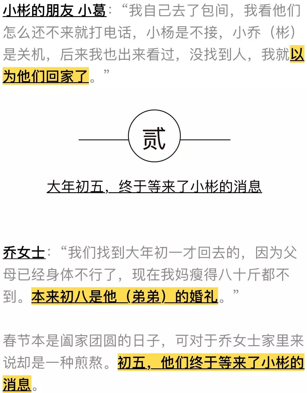 小彬的朋友 小杨:“我跟他关系也不是很熟的,那天我喝高了,在大厅还是什么位置吧,后来电话响了看到很多未接来电,我有点意识了,就打车走了。”