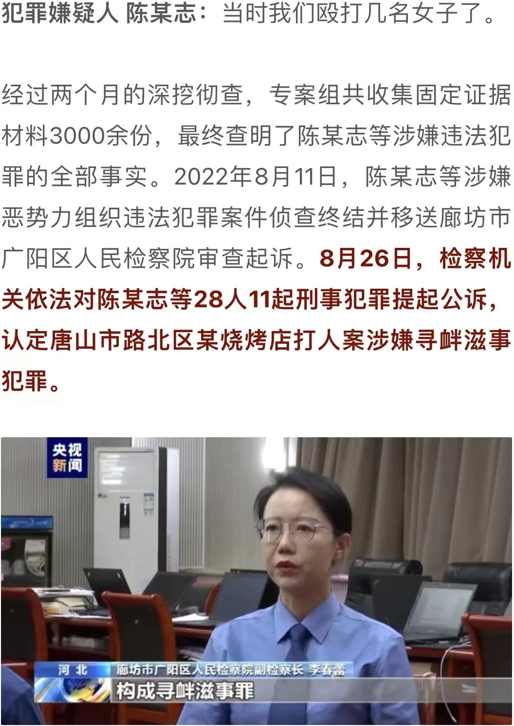 廊坊市广阳区人民检察院副检察长 李春蕾:陈某志等多人在公共场所随意殴打、辱骂、恐吓他人,造成两人轻伤,两人轻微伤,情节恶劣,其行为符合刑法第二百九十三条的规定,构成寻衅滋事罪。