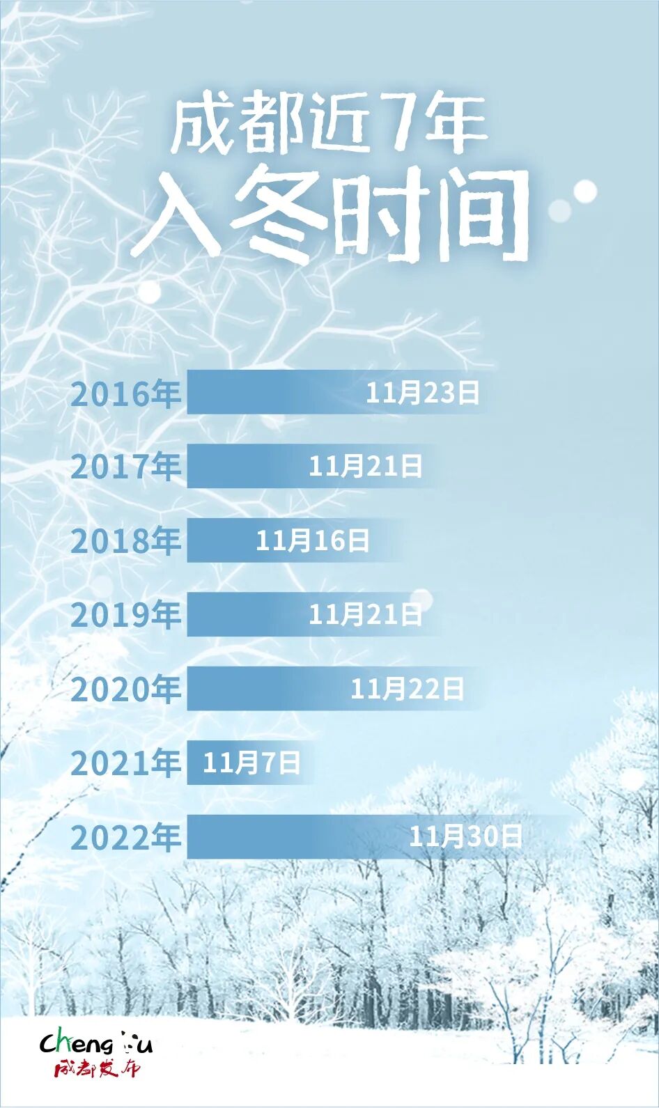 成都市常年入冬时间为11月29日。这一次降温过程冷空气比较强,气温较前期出现断崖式下降,11月30日,全市平均气温仅5.9℃,12月1日为4.9℃,预计今天平均气温在6.5℃左右,入冬已成定局。