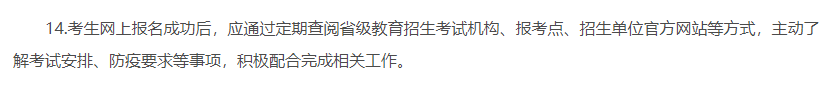 网上报名要求新增:考生网上报名成功后,应通过定期查阅省级教育招生考试机构、报考点、招生单位官方网站等方式,主动了解考试安排、防疫要求等事项,积极配合完成相关工作。