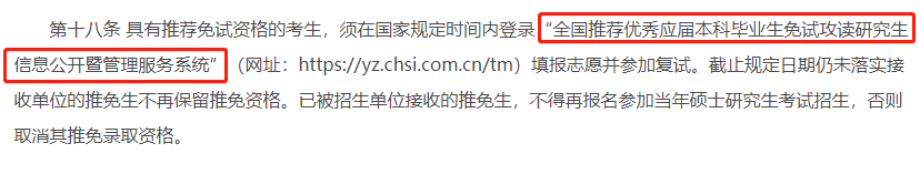 《规定》第十八条推免系统去掉“优秀应届本科生”字眼,增加“其他符合免初试攻读硕士研究生资格条件(如在部队荣立二等功等)的人员,应在国家规定的全国统考报名时间内登录“全国推荐免试攻读研究生信息公开暨管理服务系统”报名。”