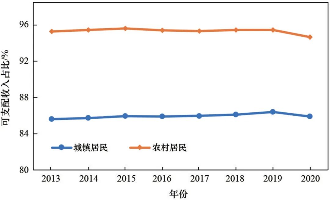 可支配收入是衡量人民生活水平的重要指标。2003—2020年,中部地区六省城乡人均可支配收入占全国的比重总体较平稳。