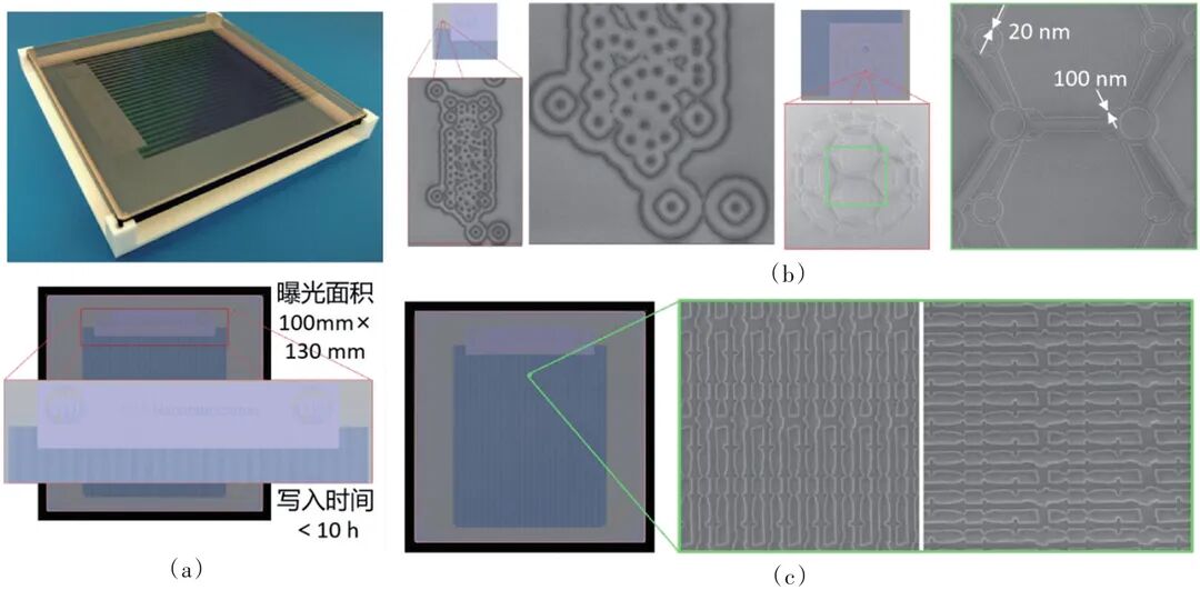 MBMW-101加工能力(a)100 mm×130 mm测试曝光样片,曝光时间小于10 h;(b)曲线ILT和足球状加工结构加工结果展示,最小结构尺寸为20 nm;样片主要测试结构,基本特征尺寸为100 nm,最小OPC结构CD为20 nm