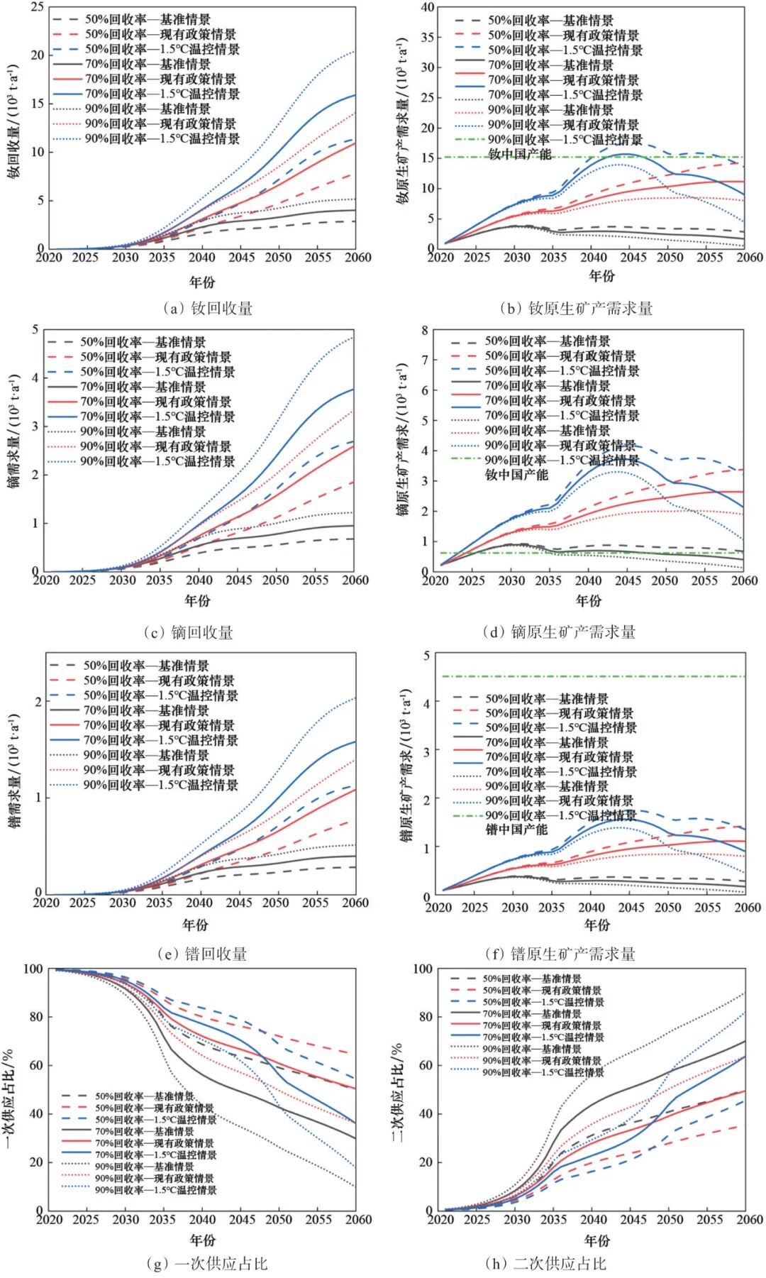 (3)通过大力发展循环经济,中国未来有望构建以再生资源为主的稀土供应结构。在基准情景下,通过大力发展稀土永磁回收,2060年再生资源的占比将升高到50.1%(低回收率情景)~90.1%(高回收率情景);在现有政策情景下,2060年再生资源的占比将升高到35.4(低回收率情景)、49.6%(中回收率情景)和63.8%(高回收率情景);在1.5℃温控情景下,2060年再生资源的占比将升高到45.6%(低回收率情景),63.9%(中回收率情景)和82.2%(高回收率情景)。