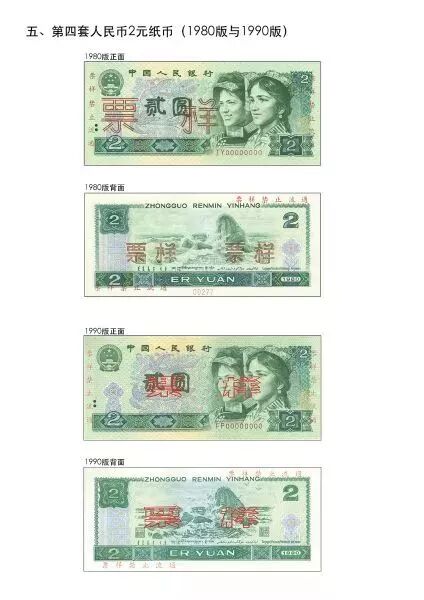 (五)第四套人民币2元纸币。其主色调为绿,正面图案为维吾尔族、彝族人物头像,背面图案为南海南天一柱。