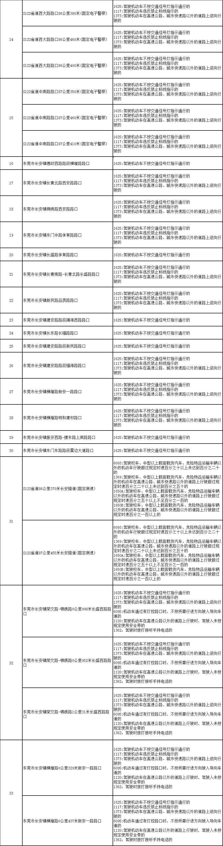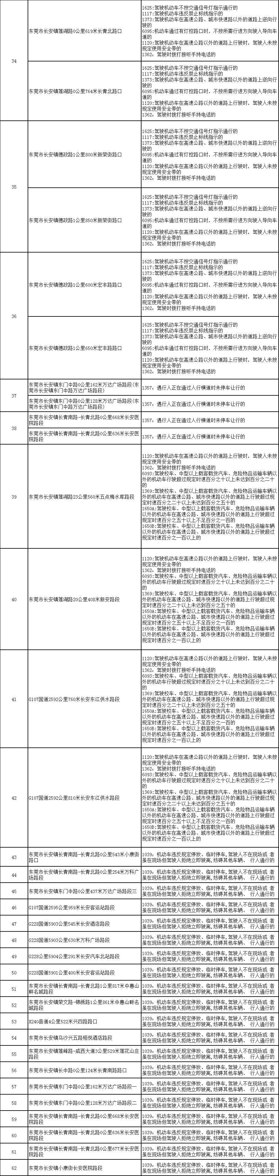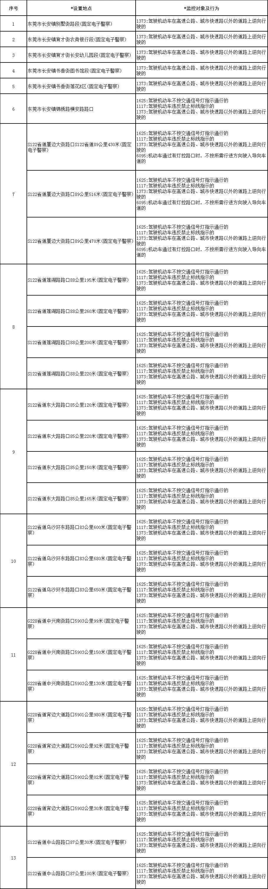 为确保道路交通安全、有序、畅通,根据《广东省司法厅关于贯彻实施<行政处罚法>第四十一条的指导意见》的相关规定要求,长安镇交警大队对长安镇正常运行的62个路口、路段的电子警察设备的设置地点重新向社会进行公示,望广大驾驶员遵守交通法规,文明驾驶、安全出行。