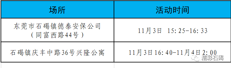 11月3日深夜,石碣镇发现一名跨区域协查从外市返莞人员初筛结果异常。请到过下列场所的市民,立即主动向居住地村(社区)、工作单位或居住酒店报备,做好个人防护,前往就近核酸检测点进行核酸检测,并配合做好疫情防控工作。