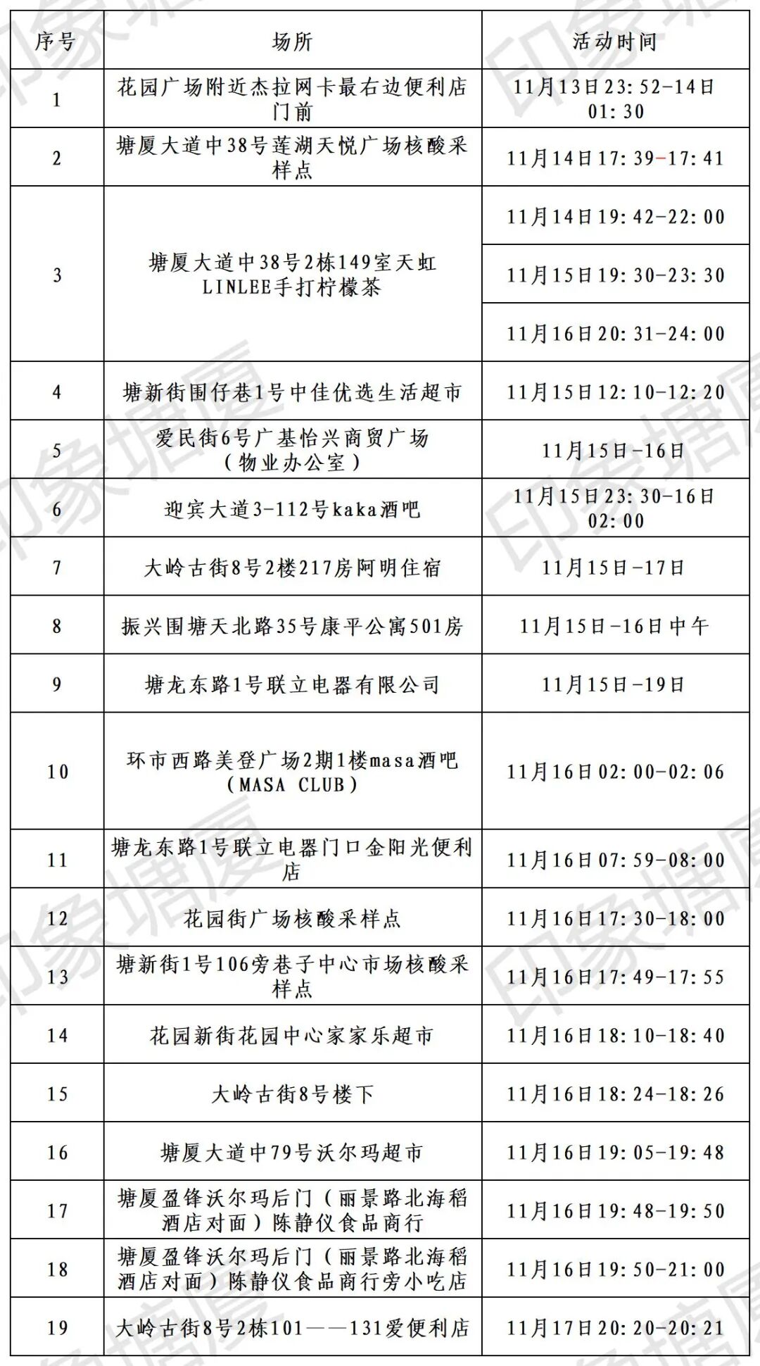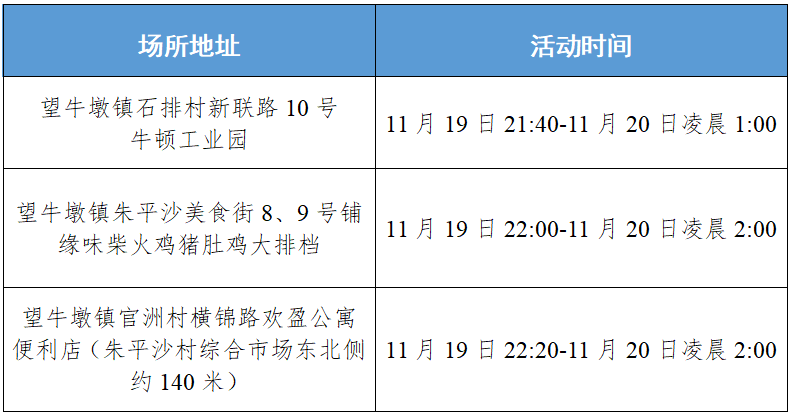 11月19日,塘厦镇在集中隔离和居家隔离人员中发现3例新冠肺炎阳性个案,请与以下场所有时空交集的居民群众立即向所在社区报备并前往就近的核酸检测采样点进行核酸检测。