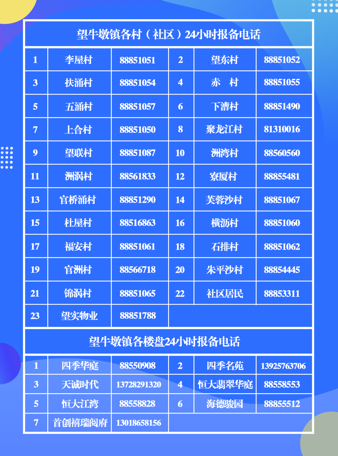 ▲望牛墩镇各村(社区)、各楼盘24小时报备电话