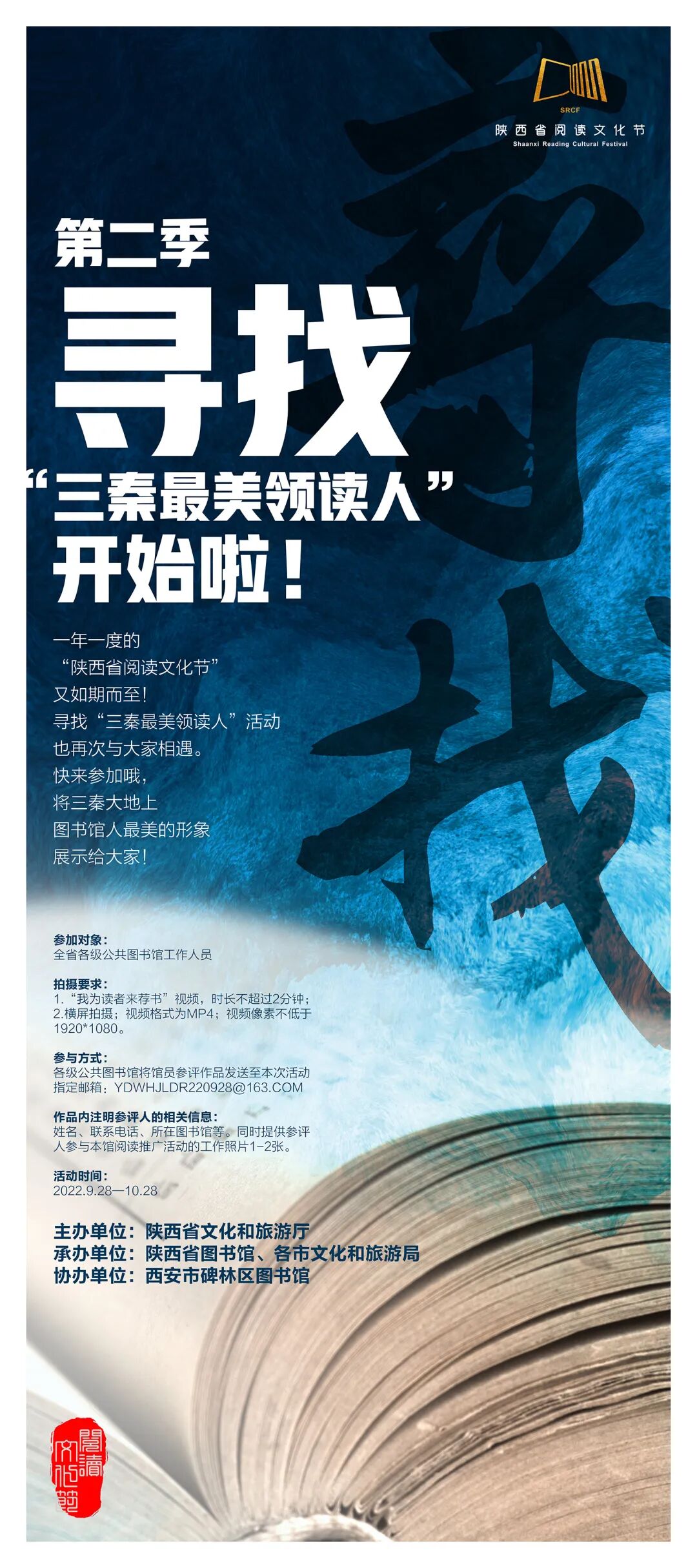 在去年第一季活动基础上,本届阅读文化节特推出第二季“三秦最美领读人”评选活动,进一步营造浓郁的阅读氛围,培养、引领广大人民群众崇尚读书、自觉阅读的习惯,宣传和展示“图书馆人”群体的精神风貌。