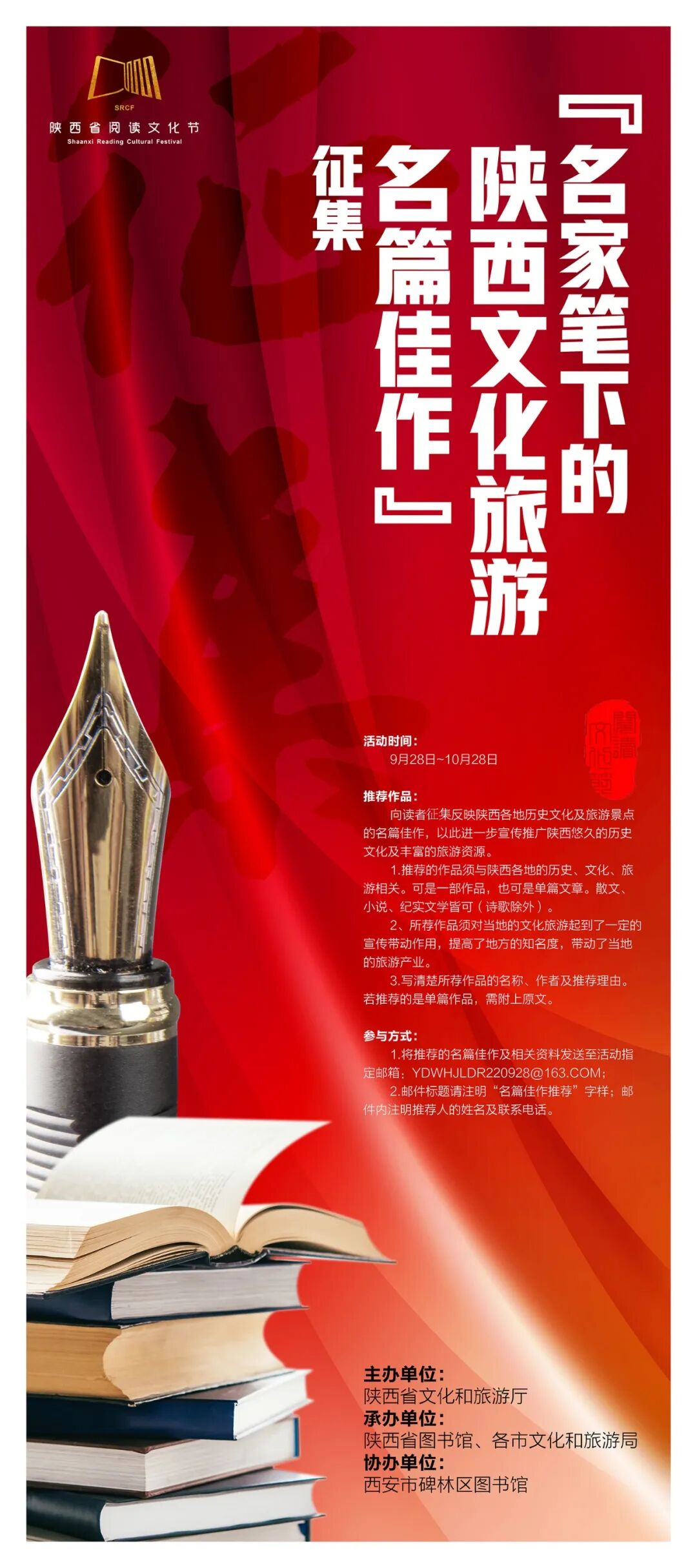 本届阅读文化节特推出“名家笔下的陕西文化旅游名篇佳作”征集活动,向读者征集反映陕西各地历史文化及旅游景点的名篇佳作,以此进一步宣传推广陕西悠久的历史文化及丰富的旅游资源。