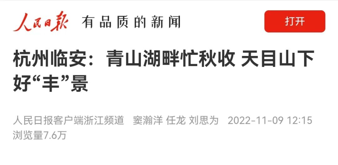 近日,人民日报客户端发表文章《杭州临安:青山湖畔忙秋收 天目山下好“丰”景》,点赞临安好“丰”景。