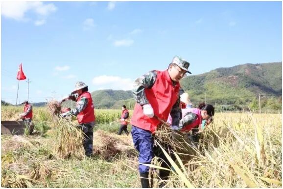 ▲ 湍口镇组织党员先锋队助力雪山大米收割