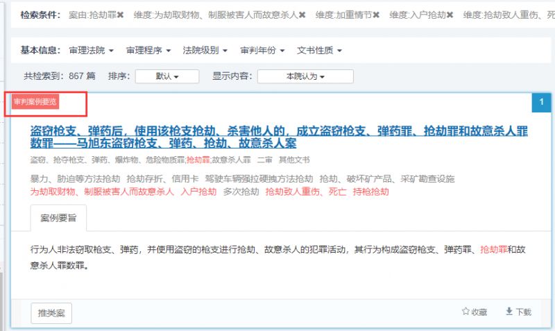 为进一步确认自己的判断,张法官继续查询了页面右侧推送的相关法信码——“在劫取财物过程中为制服被害人反抗而故意杀人的”、“入户抢劫的”、“持枪抢劫的”以及“抢劫致人重伤、死亡的”