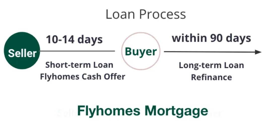 1.买家首先和 Flyhomes Mortgage 合作,通过一个10-14天的短期贷款,拿到现金,对心仪的房子下Flyhomes Cash Offer。