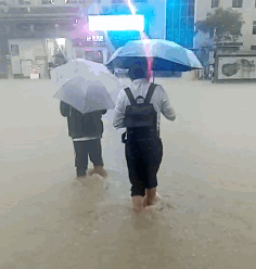 路人挽着裤腿迈着小碎步
