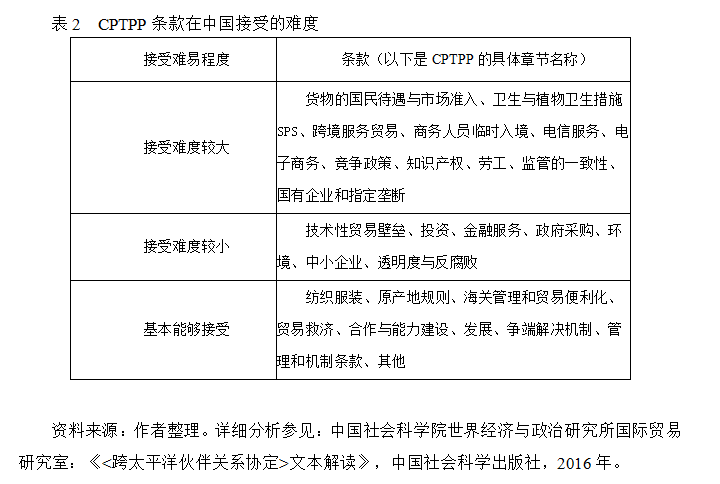 CPTPP延续了TPP规则的高标准,因此在规则接受方面,给中国提出了一定挑战。但针对不同的条款,中国可以接受的程度是有所差别的,本部分通过对CPTPP文本中的30章进行逐一分析,按照接受的难度分为三类,并给出了相应的判断依据。