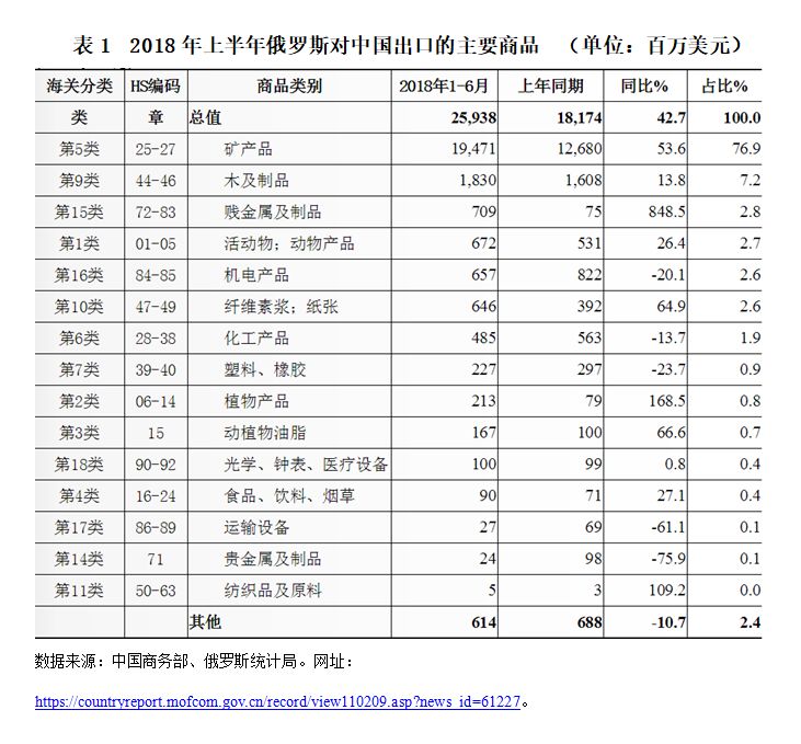 中国与俄罗斯经济结构互补性较强,经贸合作的潜力较大。作为全球第二大经济体,中国对能源和粮食等的需求量巨大,而俄罗斯经济对石油、天然气等能源出口依赖性较大,且是产粮大国,这为两国加强经贸往来提供良好的基础。从俄罗斯对中国出口的主要商品种类来看(参见表1),根据俄罗斯统计局的统计数据,2018年上半年,矿产品、木及制品和贱金属及制品是俄罗斯对中国出口的主要产品,1-6月的出口额分别占俄罗斯对中国出口总额的76.9%、7.2%和2.8%,为194.7亿美元、18.3亿美元和7.1亿美元,分别增长53.6%、13.8%和848.5%。植物产品的出口额也增长明显,增幅为168.5%。运输设备的出口额则下降了61.1%。