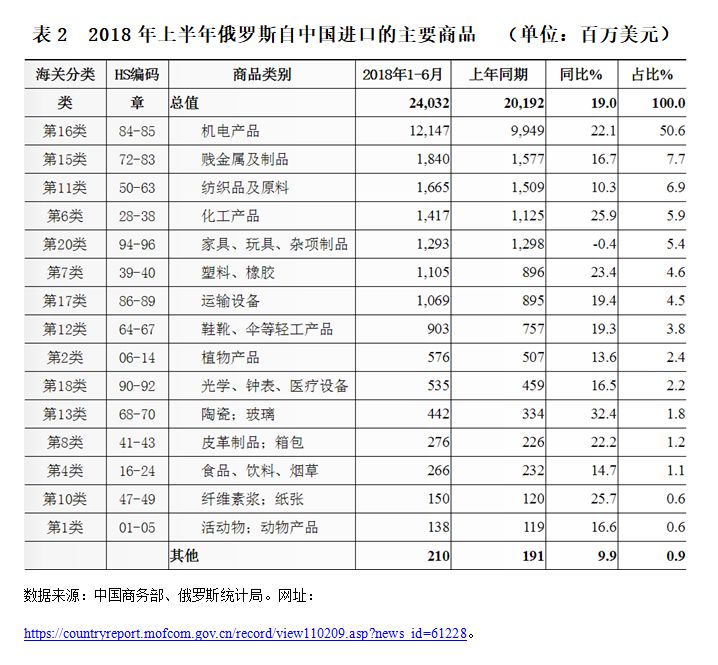 从中国对俄罗斯出口的主要商品来看(参见表2),根据俄罗斯统计局的统计数据,2018年上半年,俄罗斯自中国进口的主要商品为机电产品、贱金属及制品和纺织品及原料,1-6月三类产品进口总额占俄罗斯自中国进口总额的65.2%,为121.5亿美元、18.4亿美元和16.7亿美元,分别增长22.1%、16.7%和10.3%。这些产品在俄罗斯进口市场中分别占有35.0%、22.0%和32.1%的份额。另外,俄罗斯自中国进口的化工产品增幅较多,增长了25.9%。
