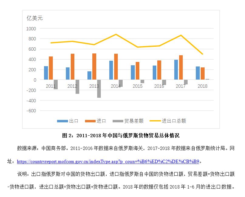 3.俄罗斯对中国货物贸易逆差较小,2018年可能由逆转正。根据俄罗斯海关和俄罗斯统计局的统计数据(参见图2),俄罗斯对中国货物贸易虽为逆差,但数额较小。2011-2014年基本维持在130亿美元至350亿美元之间,其中,2013年逆差额最高达到350.5亿美元。此后,2015-2017年俄罗斯对中国的货物逆差额基本在100亿美元以下,2015年最低时仅为63.4亿美元。2018年1-6月,俄罗斯对中国货物贸易实现顺差,约为19.1亿美元。鉴于美国与中国之间的贸易摩擦持续,促使中国减少对美国大豆和能源等的进口,转而扩大对俄罗斯豆类和原油等的进口,这使2018年俄罗斯对中国首次实现货物贸易顺差的可能性较大。