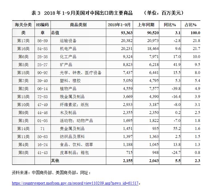 中国自从2001年12月正式加入世界贸易组织(WTO)以来,对外贸易额增长迅速,已成为全球第一贸易大国。根据WTO的统计数据,2017年中国在全球货物贸易进口和出口总额中所占比重分别为10.2%和12.8%,是120多个国家和地区的主要贸易伙伴。2001-2017年中国服务贸易进口从393亿美元增至4676亿美元,年均增长16.7%,约占全球服务贸易进口总额的10%。随着中国对外贸易的快速发展,中国与美国的贸易联系也越来也紧密,两国在国际经贸领域基本形成“你中有我、我中有你”的格局。美国拥有技术优势,居于全球价值链的顶端,中国则因成本优势处于价值链的中低端,二者的贸易结构存在明显的互补性。从美国对中国出口的主要商品种类来看(参见表3),主要为运输设备、机电产品、化工产品和矿产品,1-9月三者的出口分别203.8亿美元、202.3亿美元、93.2亿美元和88.2亿美元,占美国对中国出口总额的21.8%、21.7%、10.0%和9.5%。运输设备中的航空航天器出口额为126.6亿美元,增长12.1%;车辆及其零附件出口额为76.8亿美元,下降了20.2%。