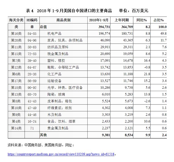 从中国对美国出口的主要商品种类来看(参见表4),主要以机电产品为主,其次为家具玩具、纺织品及原料和贱金属及制品等。2018年1-9月,美国从中国进口机电产品约1965.7亿美元,占美国自中国进口总额的49.8%,增长8.8%。其中,电机和电气产品进口1078.5亿美元,增长7.6%;机械设备进口887.2亿美元,增长10.2%。家具玩具、纺织品及原料和贱金属及制品分别位于美国自中国进口商品的第二至四位,2018年1-9月进口额分别为460.9亿美元、299.1亿美元和206.9亿美元,占美国自中国进口总额的11.7%、7.6%和5.2%,增长6.3%、2.1%和8.6%。来自中国的家具玩具和鞋靴伞等轻工产品占美国进口市场的59.9%和56.7%,与来自墨西哥和越南的同类产品相比,中国的产品具有绝对竞争优势。此外,中国在美国的机电产品、纺织品、塑料橡胶和陶瓷玻璃等产品的进口市场上也具有较强的竞争力。