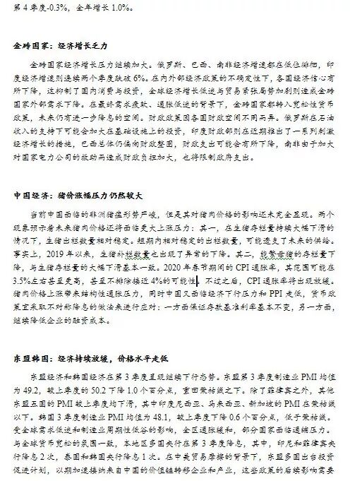 消费、投资和出口均显疲态。一直表现稳健的美国消费者信心指数由2季度98.5大幅下滑至3季度的93.4,消费韧性初显疲弱。美国Sentix投资信心指数3季度降至5.8,已连续四个季度下降,CEO经济展望资本支出分项指数连续六个季度下降,中小企业资本支出计划乐观指数连续三个季度下降,企业投资信心持续恶化。7月美国出口同比增速为-0.64%,连续四个月负增长,进口增速也快速下滑。美国发起的贸易摩擦范围不断扩大,尤其是中美互征关税导致中美双边贸易已连续九个月负增长,进一步恶化了美国对外出口。美联储两度降息。2019年8月1日美联储宣布降息25个基点,联邦基金利率目标区间下调至2%-2.25%,这是美联储时隔十年的首次降息。同时,美联储提前两个月结束资产负债表的缩减计划。美联储关于本次降息给出三个理由:全球经济增长放缓、贸易的不确定性以及通货膨胀率显著低于2%的目标。与历次美联储首次降息相比,此次降息的显著差异在于:美联储在经济基本面仍然较好的情况下实施降息,美联储关于未来货币政策释刻意放出模糊的信号。 欧元区经济继续下行。欧元区19国综合采购经理人指数(PMI)3季度均值为51.3,较上季度的均值51.8下滑0.5。9月综合PMI由8月的51.9下跌至50.4,为2013年7月以来最低水平。制造业PMI表现尤其令人担忧,3季度欧元区制造业PMI均值为46.4,较上个季度的47.7进一步下滑。9月制造业PMI由8月的47下跌至45.7,创2012年10月以来的最低水平,显示欧元区制造业收缩正在加深。欧元区制造业产能利用率继续下滑,2019年3季度产能利用率为82.2%,较上季度的82.7%再下跌了0.5个百分点。德国制造业恶化程度最突出。9月德国制造业PMI 为41.7,较前值43.5明显下滑,为2009年6月以来的最低水平。欧央行重启量化宽松。9月12日,欧洲央行召开货币政策会议,宣布下调欧元区隔夜存款利率至负0.5%,同时维持欧元区主导利率为零、隔夜贷款利率为0.25%不变。这是欧洲央行自2016年3月以来首次调降欧元区关键利率。在非常规货币政策方面,欧洲央行决定从11月起重启资产购买计划,每月购债规模为200亿欧元。为增强利率政策宽松效果,购债将持续足够长时间,预期在欧洲央行首次加息前结束。欧央行将改变新一轮季度目标长期再融资操作(TLTRO III)的模式,以保持有利的银行贷款条件。对于符合资格的净贷款额超过基准的银行,TLTRO III业务所适用的利率将会较低,甚至可能低至存款安排在整个业务期间的平均利率,期限从2年延长至3年。分层利率机制也正式出台,为了支持以银行为基础的货币政策传导,将引入双层准备金制度,使银行持有的部分过剩流动性免受负存款利率的影响。 日本经济继续下行。日本3季度制造业PMI49.2,较上季度下降0.6个百分点,连续3个季度处于荣枯线下方。服务业PMI为52.6,较上季度回升了0.8。就业方面,2019年第3季度失业率2.2%,较上季度下降了0.2个百分点,保持充分就业状态。7-8月季调有效求人倍率均值1.59,较第2季度的1.62有所下降,但岗位需求仍然明显多于求职人数。消费物价增速回落。7-8月CPI同比增长率0.4%,较第2季度的0.8%有所回落。同期核心CPI同比增长率0.5%,较第2季度的0.8%也有所下降。消费和投资增速下行,降幅有所收窄。从商业销售额看,第3季度7月和8月合计一般商品零售额同比增长率-2.9%,延续了第2季度的负增长。汽车零售额由第2季度的-0.3%转为同比正增长2.5%。7月和8月两者合计同比增长了0.3%,较第2季度-1.3%的同比负增长相比止跌回升。投资各领域中,房地产开发投资回暖。2019年7-8月新屋开工户数虽然延续同比负增长,但住宅和办公楼新屋开工建筑面积分别由上季度同比负增长转为0.1%和14.7%的正增长。机械设备相关投资增长率下滑趋势放缓。机械设备投资方面,2019年7-8月工程机械出货金额同比增长0.1%,较第2季度的0.5%有所下滑但维持了正增长;同期机械订单金额同比增长率由2季度的-5.7%收敛至-2.7%。日银短观指数第3和第4季度分别为4和2,较第1季度10和第2季度7连续下滑,但下滑幅度有所减少。日本银行继续维持宽松货币政策。日本银行2019年9月19日发布的货币政策会议信息宣布维持现行超宽松货币政策不变,短期利率继续维持负0.1%的水平;并继续以每年约80万亿日元的速度购买长期国债,使长期利率维持在零左右。日本央行继续重申,在达成2%的通胀目标之前,日本央行将坚定执行超宽松货币政策不变。在当前世界经济前景不明、10月提高消费税率的背景下,至少在2020年春季之前,日本央行将坚持当前货币政策不变,维持当前超低利率水平。在7月底举行的上次议息会议后发表的声明里,日本央行宣布维持超宽松货币政策不变,同时明确表示,如果物价上涨势头受阻,经济运行遭遇重大风险,央行将毫不犹豫地追加宽松措施。此次议息会议货币政策尚未加码,但日本央行将在10月31日政策会议之前密切评估经济数据和金融市场发展,以决定是否真的必须采取行动。 金砖国家经济增长压力继续加大。俄罗斯、巴西、南非经济增速都在低位徘徊,印度经济增速则连续两个季度跌破6%。在内外部经济政策的不确定性下,各国经济信心有所下降,这抑制了国内消费与投资,全球经济增长低迷与贸易紧张局势加剧则造成金砖国家外部需求下降。在最终需求疲软、通胀低迷的背景下,金砖国家都转入宽松性货币政策,未来仍有进一步降息的空间。财政政策因各国财政