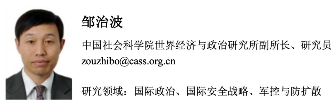 邹治波,中国社科院世界经济与政治研究所副所长、研究员。主要研究领域为国际政治、国际安全战略、军控与防扩散。曾担任联合国“监核会”(UNMOVIC)视察员、中国常驻联合国日内瓦办事处和瑞士其他国际组织代表团裁军参赞等职务。其研究成果有1项获国家科技进步二等奖,有2项部委科技进步一等奖。在国内外英文杂志与报刊上发表多篇英文文章,在《国际经济评论》《国际安全研究》《当代世界》《学术前沿》等期刊上发表学术文章十多篇,参与撰写并编辑多部“全球政治与安全黄皮书”系列丛书。