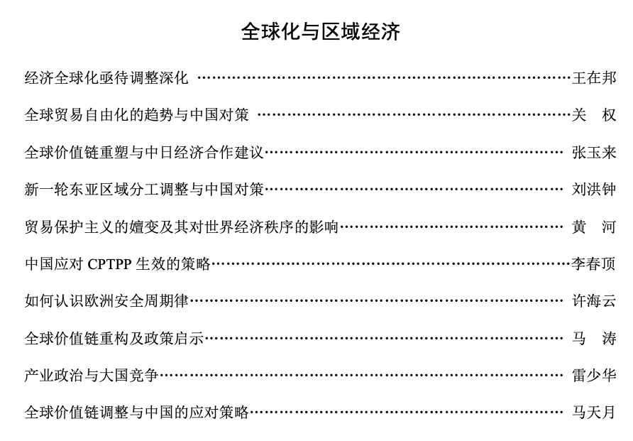 本书的第三个专题是“全球化与区域经济”。全球化是世界经济研究领域的一个不可忽视的议题,经济全球化和贸易自由化是世界未来的发展方向和趋势,世界各国都在贸易自由化的进程中获得了实实在在的好处。在对该议题进行研究时,专家们认为,加入国际分工体系、融入全球价值链,是包括中国在内的东亚地区成长为世界经济重要中心的原因之一。进入21世纪以来,随着贸易摩擦的加剧以及逆全球化趋势的出现,这些因素对既有的全球价值链体系带来了挑战,迫使国际经济秩序开始出现重构,区域经济一体化的作用也日益上升。从长远来看,扩展全球价值链体系是深化经济全球化的重要途径,也是维护多边主义的有效手段,构建包容的全球价值链是未来世界经济的发展方向。
