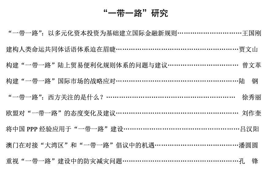 “一带一路”倡议让中国以新姿态走向世界,世界也通过参与“一带一路”建设再次认识了中国。随着“一带一路”建设的不断深入,我们对该倡议的描绘已经从“大写意”转向了“工笔画”,对“一带一路”的研究也从宏观愿景与内涵意义等概念层面的阐释转向具体研究以及实际的对策层面上来。本书的“一带一路”专题首先关注的是“一带一路”的国际金融规则、陆上贸易便利化规则体系、国际市场战略及人类命运共同体话语体系等规则体系的建构。其次,该专题重点考察了西方社会精英层和欧盟一些国家对“一带一路”倡议的认知态度与利益诉求,探讨了如何顺利开展“一带一路”的PPP建设、“一带一路”建设中的防灾减灾如何具体实施等问题。最后,本专题还分析了我国澳门地区对于“一带一路”在葡语国家中顺利开展的重要作用。