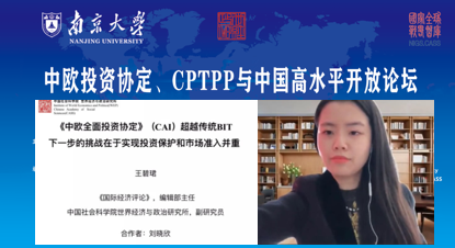 2021年1月12日,中国社会科学院世界经济与政治研究所、中国社会科学院国家全球战略智库与南京大学成功联合举办“中欧投资协定、CPTPP与中国高水平开放论坛”,论坛由中国社会科学院世界经济与政治研究所国际贸易研究室、南京大学自贸区综合研究院以及南京大学华智全球治理研究院共同承办,由国家社科基金重大项目“构建面向全球的高标准自由贸易区网络与治理规则研究”(20ZDA100)和“推动‘一带一路’贸易和投资自由化便利化研究:量化评价与推进战略” (18VDL014)课题支持。为配合疫情防疫工作,本次论坛以线上形式展开。会议由中国社会科学院世界经济与政治研究所党委书记姚枝仲研究员和南京大学商学院副院长、南京大学自贸区综合研究院院长于津平教授出席开幕式并致辞。此次会议设有“中欧投资协定、CPTPP与高水平开放”、“中欧投资协定、CPTPP与新发展格局”两个议题,分别由南京大学长江三角洲经济社会发展研究中心张二震教授和中国社会科学院世界经济与政治研究所倪月菊研究员主持讨论。此次论坛邀请了来自中国社科院、北京大学、清华大学、南开大学、中国人民大学、复旦大学、中国农业大学以南京大学等十余位著名专家学者共同探讨。众多国内外院校师生以在线方式参与讨论交流,参会和观看直播人数达3560余人。