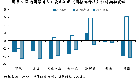 2021年第1季度PMI继续回升。东盟整体制造业PMI回升至50.6,较上季上升0.8;韩国制造业PMI继续上升,为54.6,较上季上升2.3。月度数据显示,东盟第1季度PMI的回升主要贡献来自1月,为51.4,2月又跌至荣枯线之下,为49.7,3月回升至50.8,这反映东盟地区复苏仍不稳固,从而造成景气水平的波动;分国别来看,印尼、泰国和马来西亚PMI波动较大,新加坡、菲律宾和越南则显著向好。韩国PMI走势强劲,1月为53.2,2月和3月上升并保持在55.3的高位。这意味着,以区内前沿经济体的景气情况来看,PMI所反映的制造业复苏仍在加速。区内通货紧缩压力继续缓和,未出现明显通胀压力。2021年第1季度,区内经济体的价格水平多保持平稳。马来西亚和新加坡在2020年受疫情影响,出现了持续的通货紧缩,这一局面在今年2月终止,反映疫情冲击影响正在逐渐减退。越南、韩国和泰国的CPI同比增速均在1%以下。印尼通胀水平也保持在1.4%左右的低位,这一低通胀水平反映疫情仍在印尼国内蔓延,相应的限制措施抑制了国内需求,使得通胀保持在较低水平。区内仅菲律宾通货膨胀水平较高,2月核心通胀率为3.5%,整体通胀率达到4.7%,已超过政府通胀目标区间4%的上限,其原因主要是台风和非洲猪瘟带来食品价格的上涨。尽管区内总体通胀未现,但在未来数月,需要关注通胀抬升的可能性。通胀压力首先将源于供给面,且主要是来源于全球大宗商品价格和运输价格抬升的传导,在年中之后,疫情进一步好转和消费需求的恢复则将带来需求面通货膨胀压力。![]()