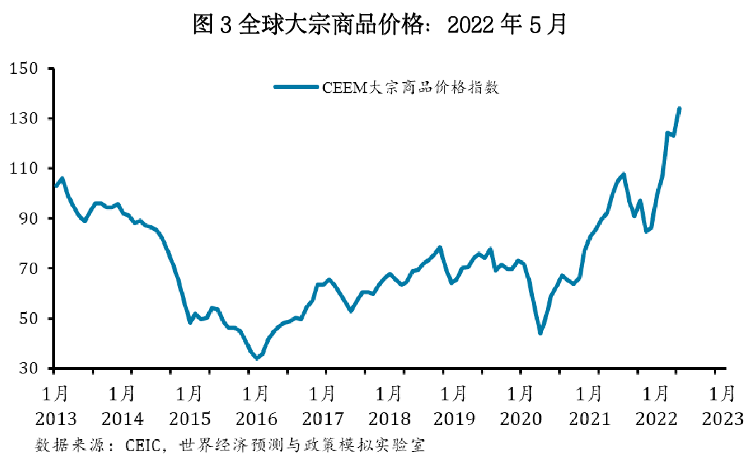 5月CEEM大宗商品价格指数环比再次反弹8.9%。受夏季出行旺季和俄乌战争延续的影响,原油价格上涨12.5%,布伦特油价再次上探120美元上方。但随着加息压力上升和需求回落,油价进入6月后震荡下行。煤炭作为替代能源价格暴涨30%。钢材和铁矿石均下跌。大豆上涨。大宗商品价格上涨推动BDI指数回升。黄金价格则在美联储加息压力下回落。