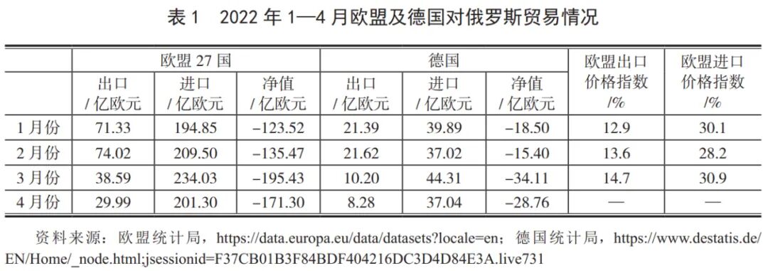 俄乌冲突爆发后,无论是欧盟整体还是德国,对俄罗斯的商品贸易都出现了一致走势。欧盟27国对俄罗斯出口额在3月份和4月份呈现断崖式减少,除了冲突本身的影响之外,也与欧洲和美国对俄制裁有关。与此同时,欧盟国家从俄罗斯进口商品总额则大体保持不变。这主要是受到以能源为代表的大宗商品价格上涨的影响——即使进口商品的数量减少,总额依然可以保持大体稳定。德国的情形与欧洲整体情况类似。俄乌冲突爆发后,德国对俄罗斯的商品贸易账户逆差迅速扩大。无论是欧盟整体还是其中最重要的国家之一德国,对俄贸易账户恶化都会直接导致整体贸易账户的恶化。以欧盟27国为例,2021年2月和3月,欧盟27国对外贸易顺差分别为213.7亿欧元和187.3亿欧元 ;而2022年2月和3月,则转为贸易逆差,分别为176.0亿欧元和289.3亿欧元。在净出口减少的389.7亿欧元和476.6亿欧元中,对俄罗斯净出口的减少分别贡献了103.5亿欧元和164.2亿欧元。贸易账户的恶化会对GDP核算产生负面冲击(详见表1)。